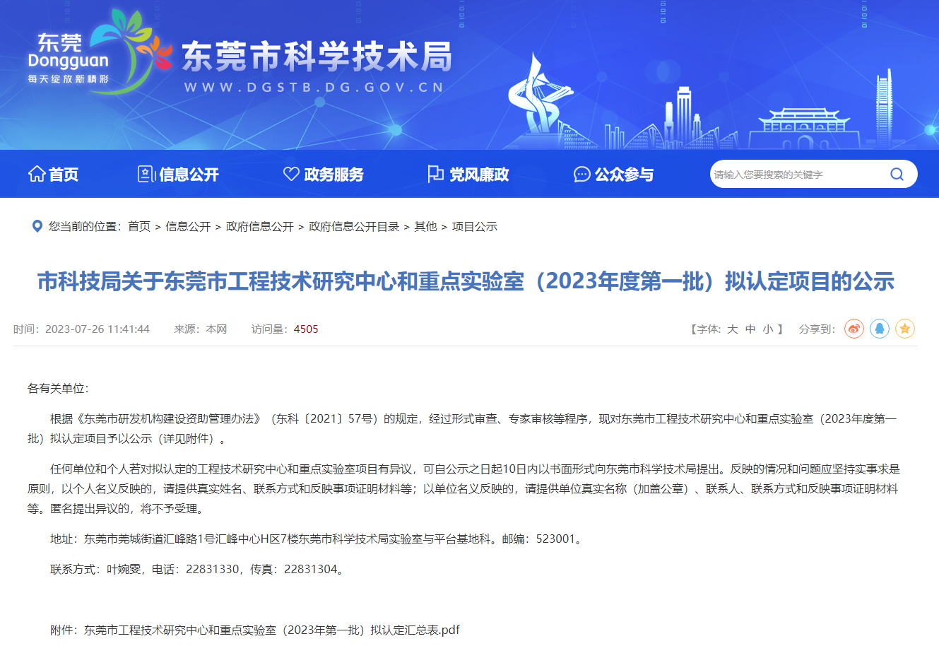 近日,东莞市科学技术局发布了《关于东莞市工程技术研究中心和重点实验室(2023年度第一批)拟认定项目的公示》(项目已过公示期),其中,由广东九州(中国)组建的“东莞市智慧城市工程技术研究中心”顺利通过认定。